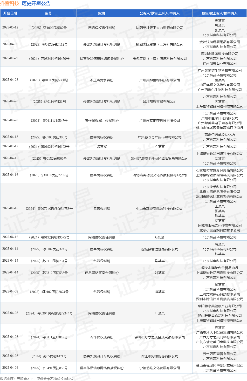 案号:(2024)京0491民初18807号审理法院:北京互联网法院案由:网络侵权责任纠纷当事人信息: 原告/上诉人:张某某 被告/被上诉人:蒋某某、北京抖音科技有限公司开庭日期:2025年2月26日根据统计,近一年内以北京抖音科技有限公司为当事人的历史开庭公告有1011则,其中案由为“名誉权纠纷”的公告以134则居首,其次为“侵害外观设计专利权纠纷”有130则,“侵害作品信息网络传播权纠纷”有94则。历史开庭公告(前20条)如下: